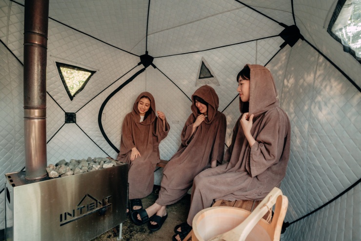 SUPで体を動かしたあとは、テントサウナでリラックス。