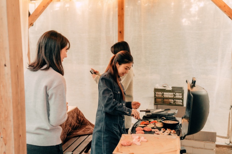 みんなで焼いて、食べて、話して。グループ旅行ならではの楽しいひとときです。