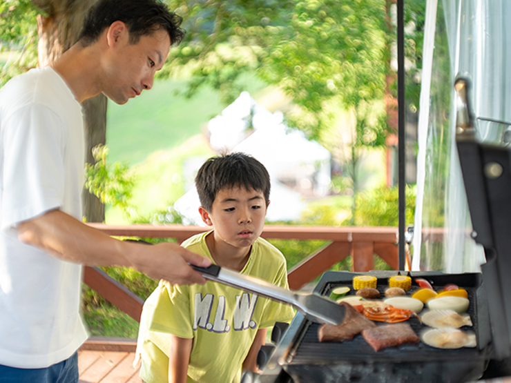 夕食は、福島牛を使用したBBQを専用デッキで楽しめます。自分たちでお肉や野菜を焼けるので、お好きなペースで味わえますよね!