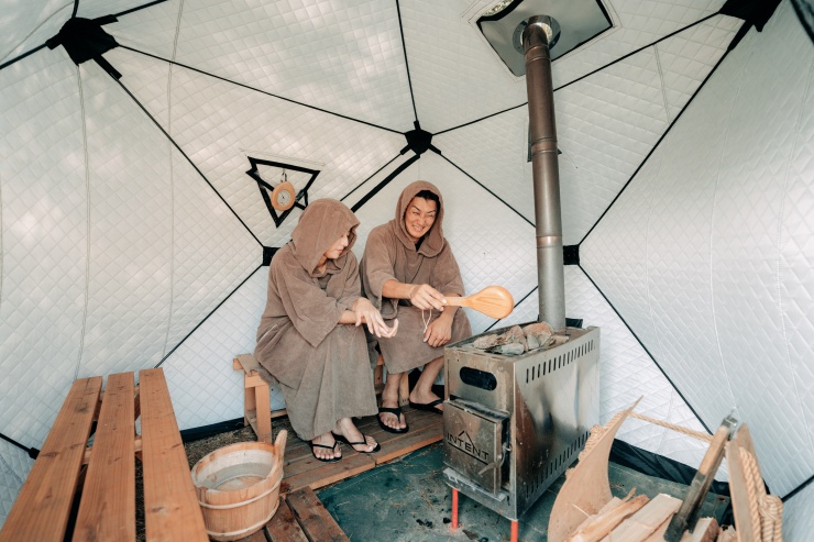 川の前と滝の前の2種類あり、テントサウナは室内温度が90℃近くになります!
