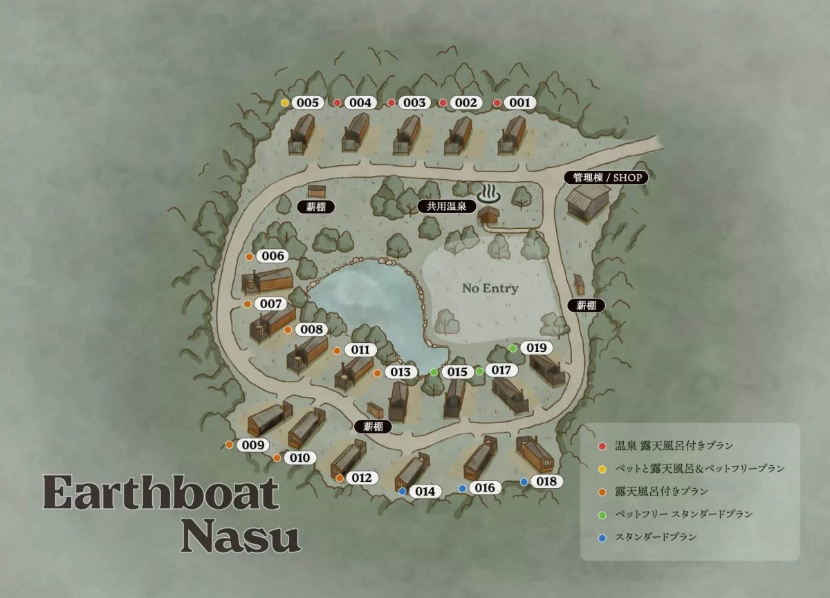 Earthboat Nasuでは桶水風呂とは別に、那須湯本の硫黄泉を掛け流しで楽しめる専用の露天風呂付き客棟を備えています。