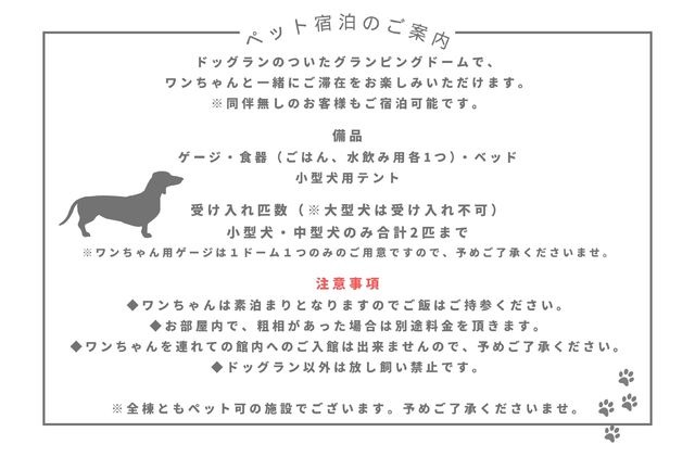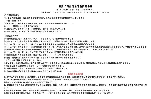 ・ワンちゃん同伴の際は、必ず愛犬同伴宿泊滞在同意書およびペット宿泊のご案内をご確認の上でご予約をお願いいたします