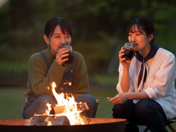 焚き火を囲みながら、スパイス香るホットワイン(無料)を楽しむ屋外体験です。