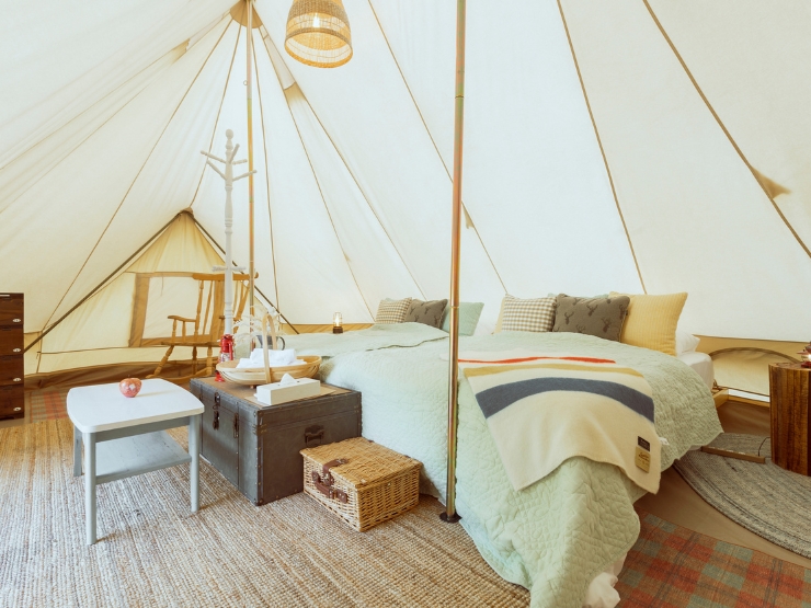 テントサイトの奥にたたずむ木々に囲まれた静かな客室。6m幅の大きなテントに、ダブルベッドを2台設置しています。ご家族、パートナーやお友達とゆっくり、プライベートな空間で贅沢な時間をお楽しみください。