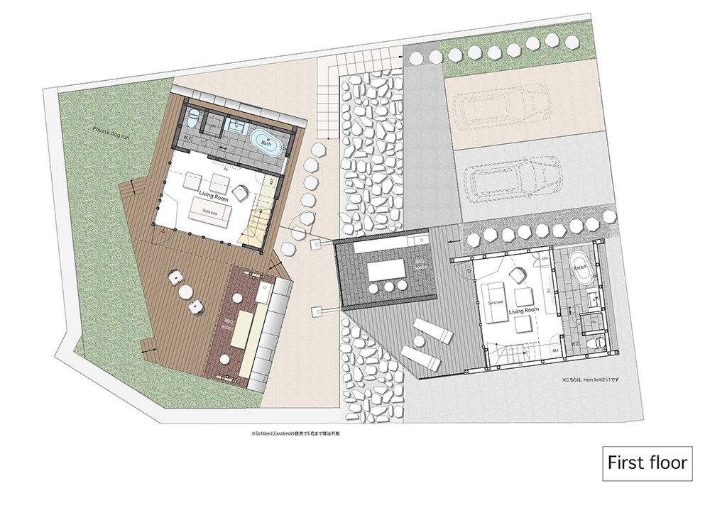 専用芝生庭 / 屋根付き専用BBQスペース / 専用洗い場(洗剤、スポンジ設置)/ ゴミ箱(分別現地処分)