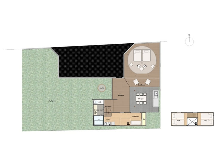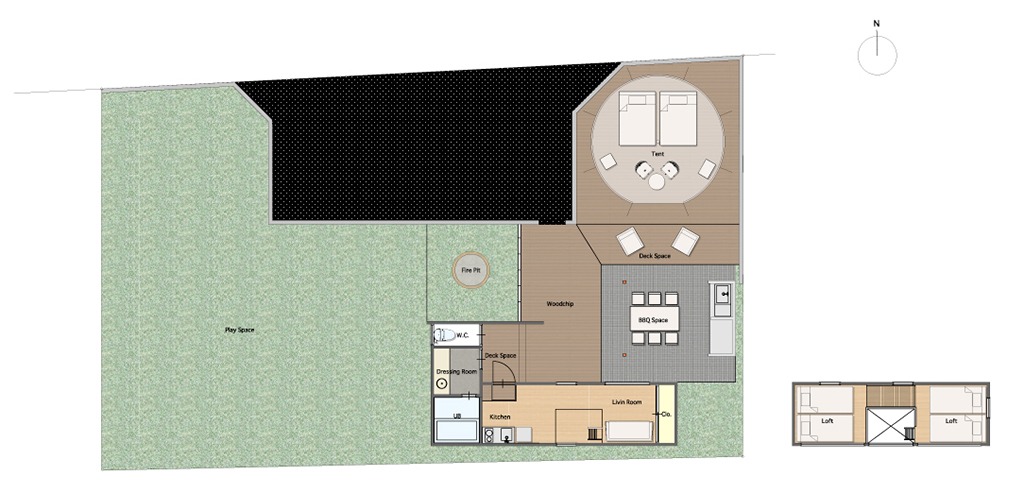 敷地内にはテントと別荘が並び、気分に合わせてアウトドア体験と快適な室内滞在を楽しめるのが魅力。さらに屋根付きのバーベキュースペースや、プライベートに使えるプレイスペースも完備しており、ご家族や仲間と非日常のひとときを過ごせます。