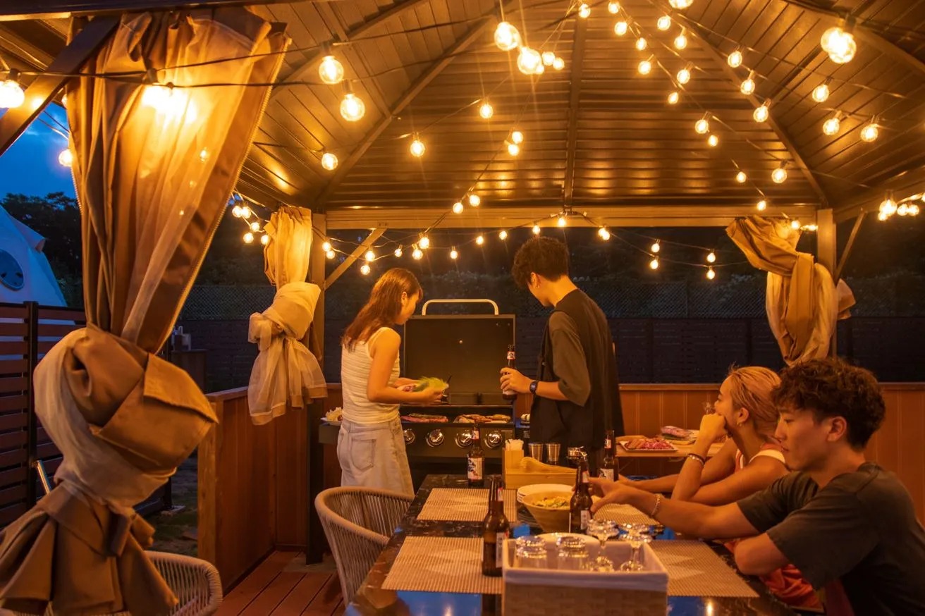 屋根のついた快適なエリアで、贅沢お肉と美味な海鮮の両方を味わい尽くすBBQです。