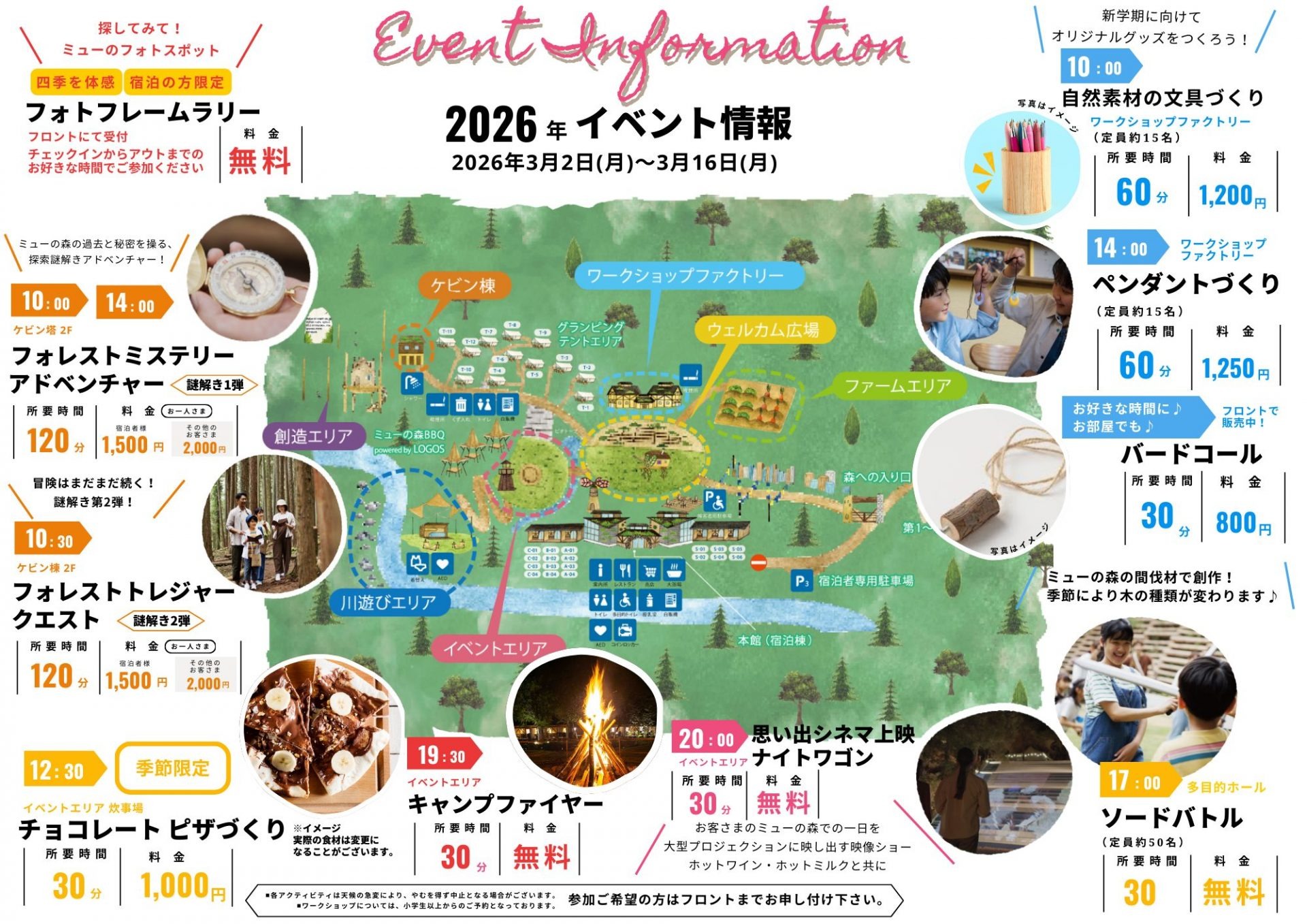 【3/2~3/16イベント】春の冒険と新学期の準備!山梨グランピング「ミューの森」期間限定イベント